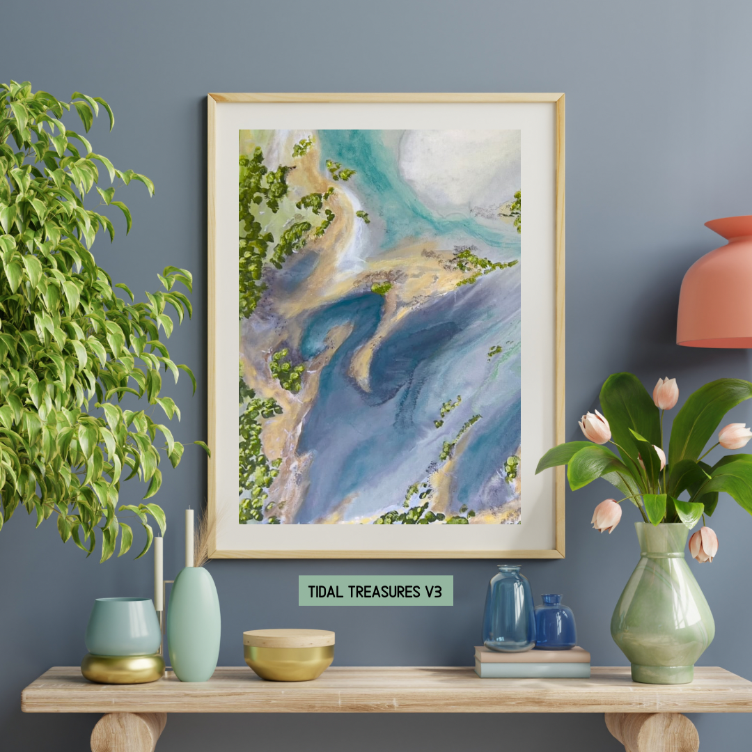 This is a print of the original artwork by Hervey Bay artist: Joleen Ford, celebrating the coastal views of the Fraser coast and the aerial views - tidal treasures that are formed, and renewed every day