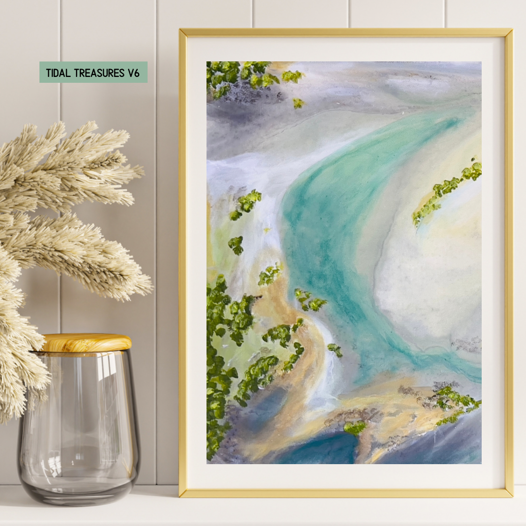 This is a print of the original artwork by Hervey Bay artist: Joleen Ford, celebrating the coastal views of the Fraser coast and the aerial views - tidal treasures that are formed, and renewed every day