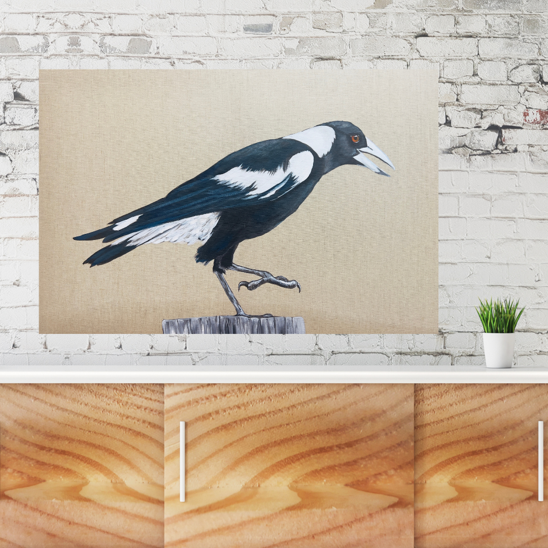 Acrylic painting on canvas of a magpie frozen in motion on linen canvas