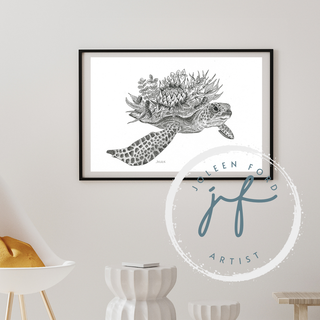 Turtle Floral Back Prints - an ink sketch using a stippled effect by artist Joleen Ford, all prints are printed on 300gsm high quality paper.